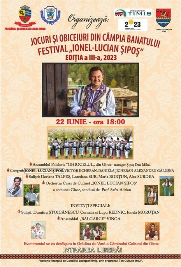 Joi, 22 iunie, Casa de Cultură "Ionel Lucian Șipoș" din comuna Giroc din județul Timiș va găzdui cea de-a treia ediție a Festivalului de jocuri și obiceiuri din Câmpia Banatului "Ionel Șipoș".