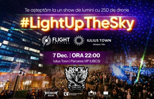 Tot joi, poți experimenta arta și un spectacol în aer liber în cadrul „Light Up The Sky”, unde 250 de drone vor realiza o sincronizare pe cer într-un „dans” inedit. Spectacolul începe la ora 22.00 și este cel mai bine vizibil din parcarea UBC VIP UBC3 a Iulius Town. „Light Up The Sky” implică un grup de drone care zboară simultan și sunt programate să execute mișcări și modele coregrafice, precum: forme geometrice, litere, figuri sau să creeze imagini, inclusiv clădiri emblematice din Timișoara, dar și efecte luminoase în aer.