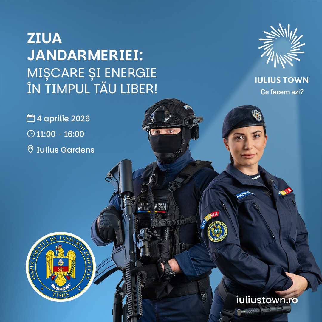 Sâmbătă, în intervalul 11:00 – 16:00, în Iulius Gardens are loc evenimentul dedicat Zilei Jandarmeriei Române, unde vor avea loc exerciții antitero și demonstrații de dresaj canin. Cei mici sunt așteptați să traseele interactive și activitățile recreative cu obstacole ușoare, jaloane și bârne.