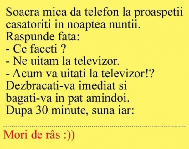 Soacra mica da telefon la proaspetii casatoriti in noaptea nuntii. Raspunde fata: – Ce faceti ? – Ne uitam la televizor. – Acum va uitati la televizor!? Dezbracati-va imediat si bagati-va in pat amindoi. Dupa 30 minute, suna iar: – Ei, acuma ce faceti? – Stam amindoi in pat si citim. – Zi-i lu’ barbata-tu sa-si bage ce are el mai lung acolo pe unde faci tu pipi. Dupa alte 30 de minute: – Ei, acuma cum e? – Eu citesc, iar Nelu incearca sa-si scoata piciorul din WC.