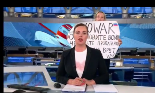 Marina Ovsiannikova si-a riscat literalmente libertatea, daca nu chiar viata, cand a intrat in direct luni seara in cel mai urmarit buletin de stiri din Rusia cu pancarta care critica ofensiva militara rusa din Ucraina si devoala cenzura dura a presei din tara sa.