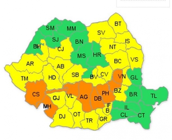 Administratia Nationala de Meteorologie a emis o avertizare meteo cod portocaliu valabila de miercuri de la ora 16.00 pana joi la ora 02.00. Sunt anuntate ploi torentiale, descarcari electrice, vant puternic si caderi de grindina.