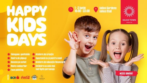 Pentru cei care preferă ciocolata în loc de orice fel de mâncare, cei care încă au o jucărie preferată, pentru cei la care încă vine Zâna Măseluță, pentru cei care dorințele abia încep să prindă contur am pregătit două zile pline de magie și distracție în Iulius Town. Pe 1 și 2 iunie are loc Happy Kids Days, care transformă Iulius Town într-un teren de joacă cu tobogane, roata cadourilor, desene pe asfalt, ateliere creative, spectacole de teatru, discoteca copiilor și multe alte surprize. Vino cu cel mic în Iulius Town, în acest weekend!