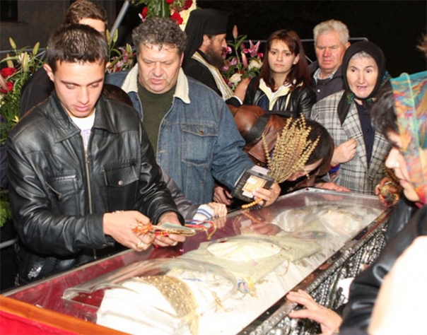 Dupa slujba din Catedrala Mitropolitana, moastele au fost scoase in procesiune si depuse spre inchinare in curtea lacasului de cult. Deja , mii de pelerini se afla in rand si asteapta sa ajunga la moaste. In momentul in care moastele au fost scoase in procesiune, multumimea de credinciosi aflata in catedrala s-a imbulzit spre iesire, oamenii dorind sa atinga racla sfintei.