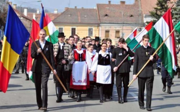 Etnicii maghiari au venit la mars cu steaguri ale Romaniei, Ungariei, Transilvaniei si ale Tinutului Secuiesc.