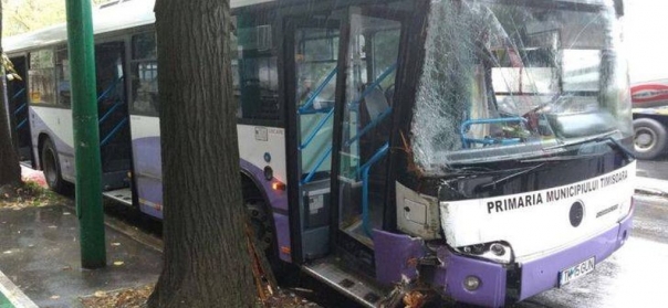 Accident de circulatie, luni, pe bulevardul Republicii din Timisoara. Un autobuz al RATT s-a lovit de un pom de pe marginea drumului dupa ce soferul a franat brusc pentru a evita un accident.
