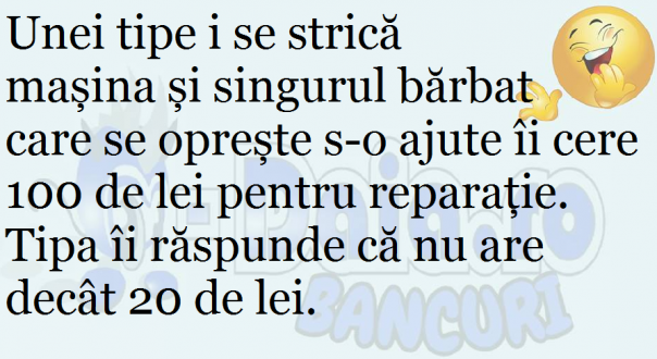Unei tipe i se strică mașina și singurul bărbat care se oprește s-o ajute îi cere 100 de lei pentru reparație. Tipa îi răspunde că nu are decât 20 de lei.