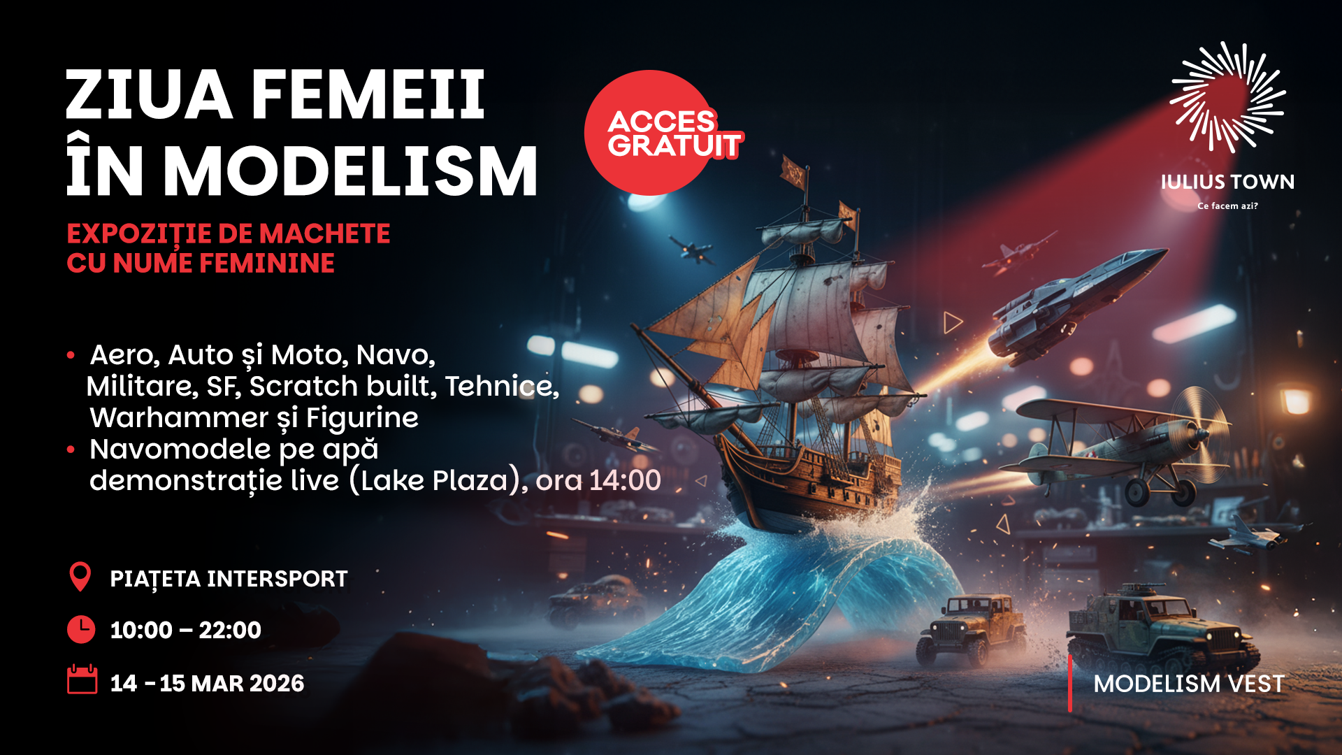 Expoziția de machete revine la Iulius Town cu o ediție specială, ce reunește modele din categorii diverse, precum Aero, Auto și Moto, Naval, Militare, SF, Scratch Built, Tehnice, Warhammer și Figurine, dar și o categorie specială dedicată machetelor cu nume feminine. Evenimentul va avea loc în perioada 14 – 15 martie 2026, în piațeta Intersport. Sâmbătă, în intervalul orar 14.00 – 15.00, pe lacul din Iulius Gardens va avea loc și o demonstrație live cu mai multe navomodele. Mai multe informații despre Expoziția de machete puteți afla pe site-ul Iulius Town.